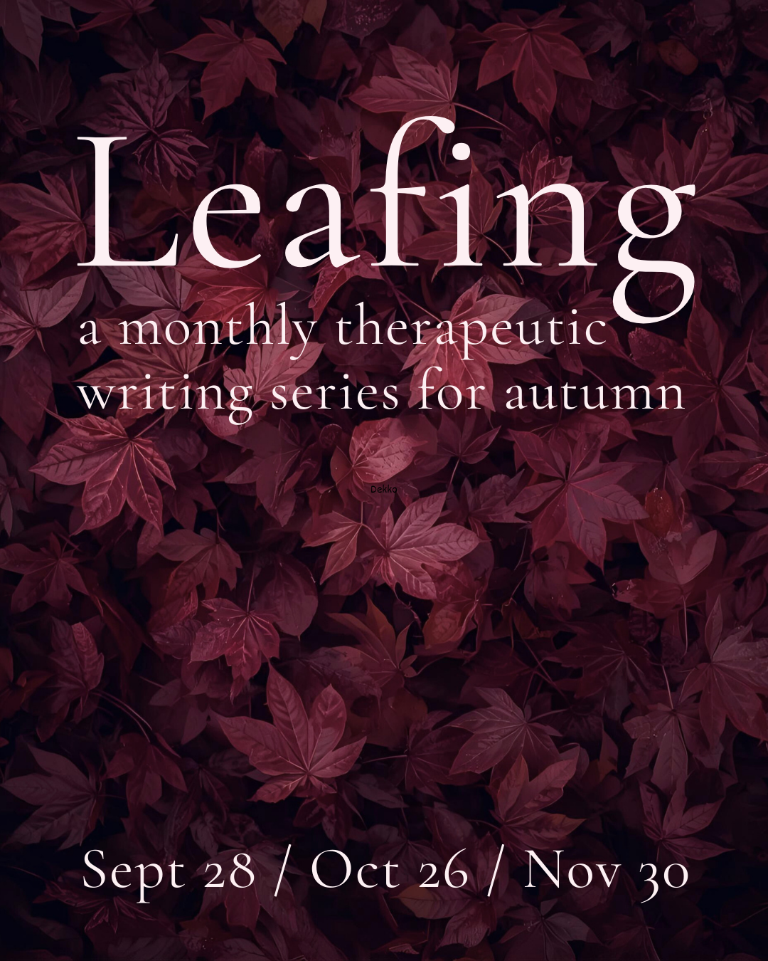 Sept 28 to 30 Nov Leafing - Writing into Autumn Sun, 28 Sept 2025 18:00 Sun, 30 Nov 2025 19:15 Google Calendar ICS Enjoy the good company of your own words this Autumn. View Event →